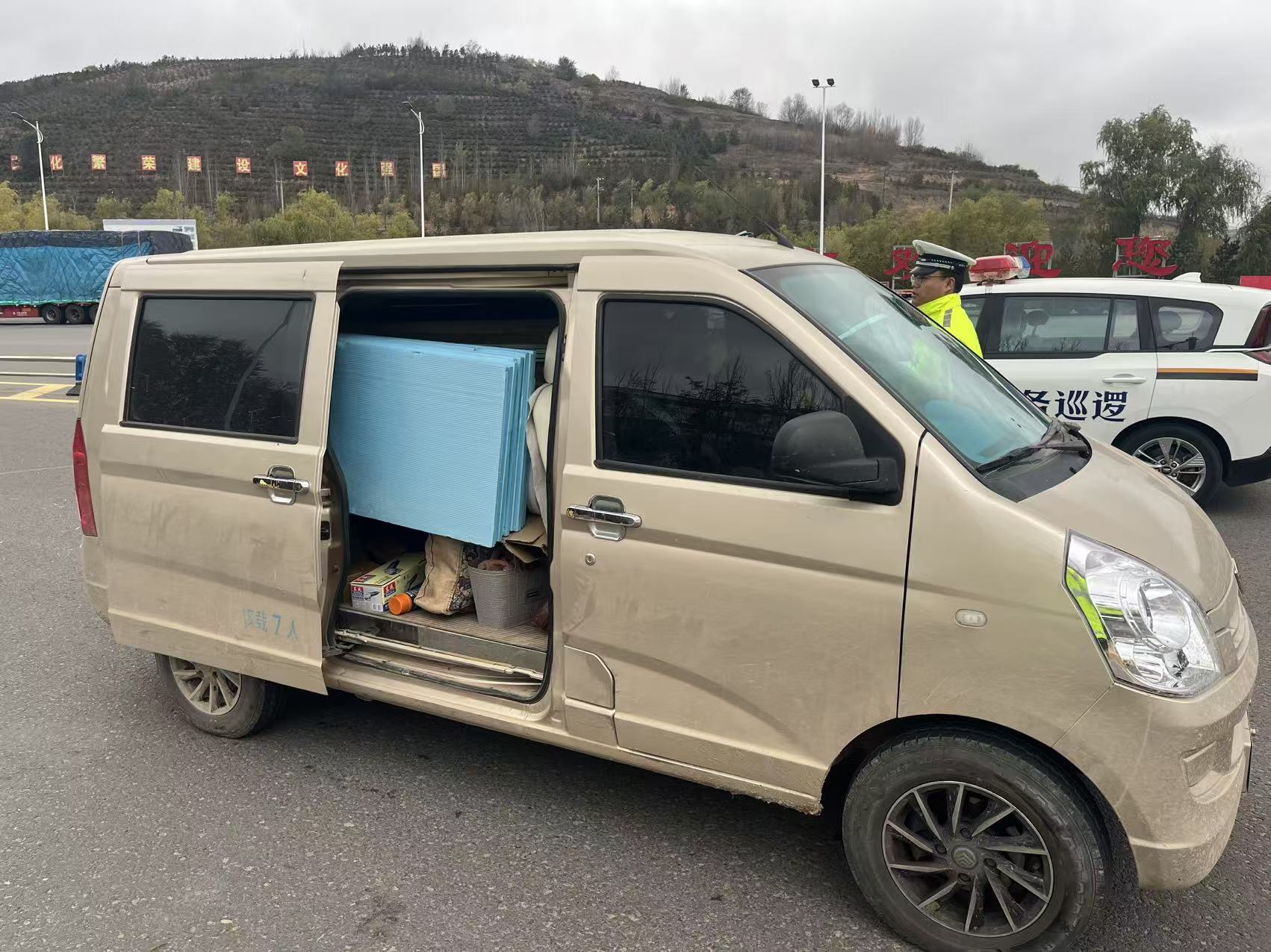 2025年11月4日,固原高速交警二大队在西吉东收费站执勤时,发现一辆面包车疑似客货混装,随即示意驾驶员停车接受检查。发现该车辆后排座位直到车尾部全部被货物塞满,存在极大的安全隐患。