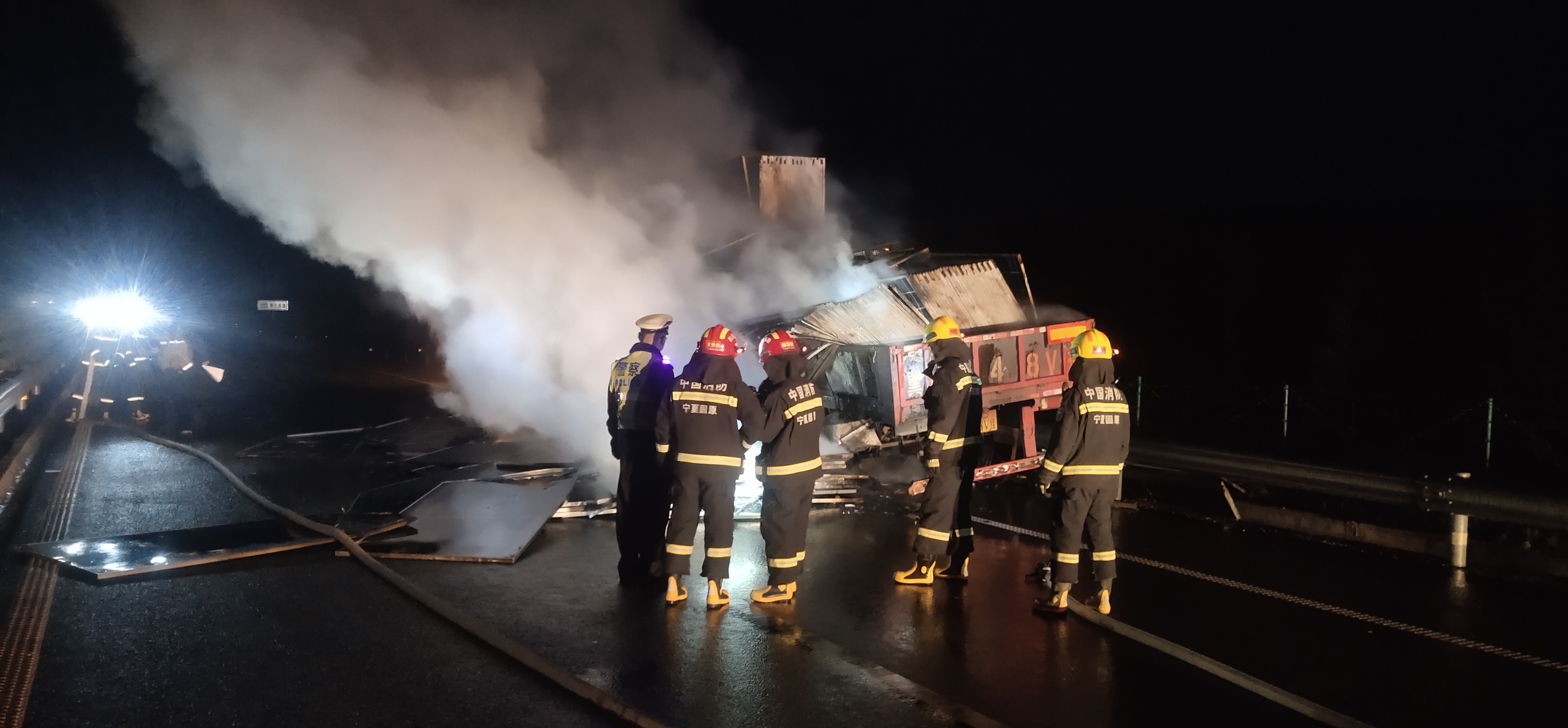 11月14日清晨,固原高速交警三大队接指挥中心指令,一重型半挂车行驶途中突然起火,要求大队迅速出警。值班民警接警后立即出发赶往现场,并及时呼叫了救援、养护、消防等协作单位共同赶往现场处置该起警情。