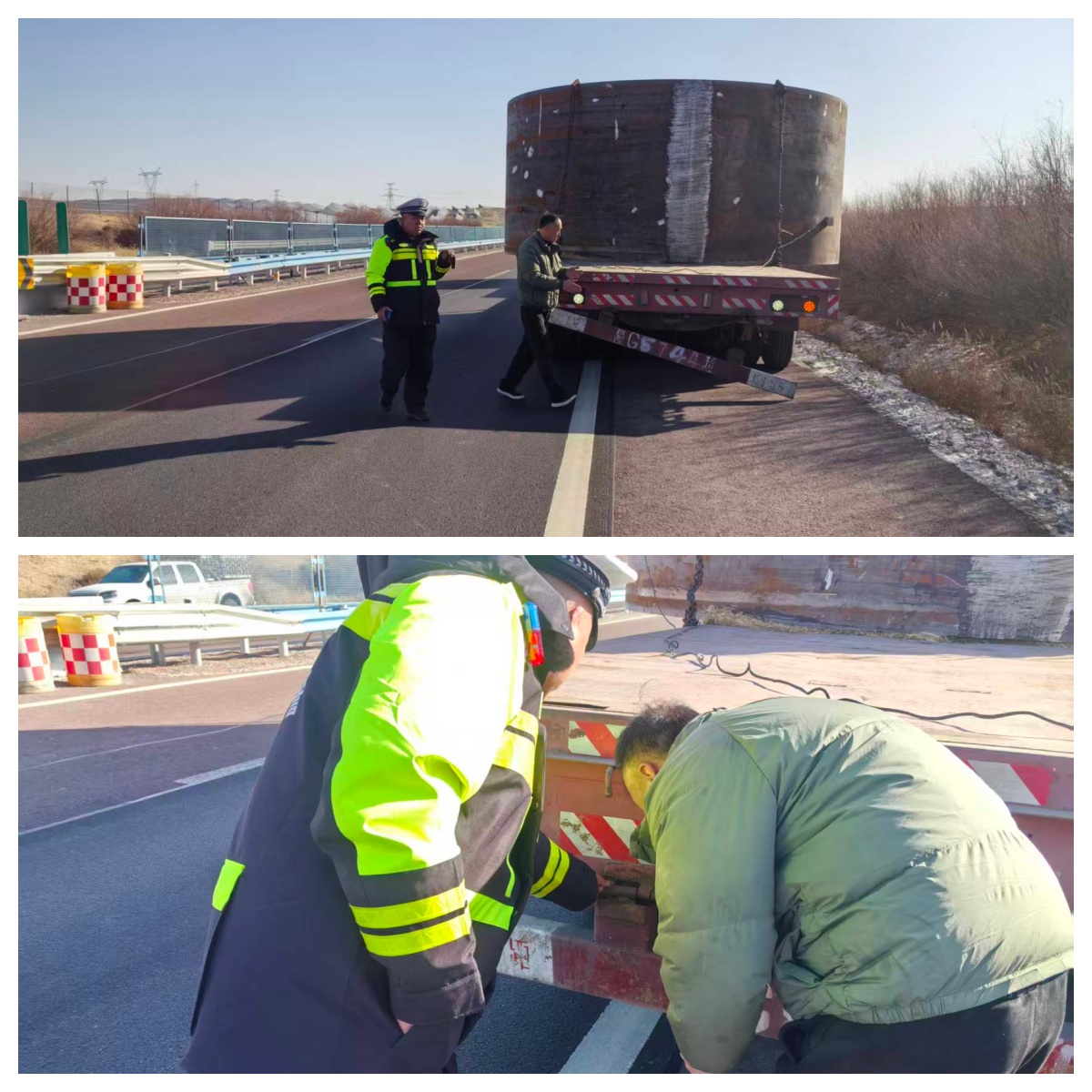 1月16日11时许,中卫市公安局交通管理局高速公路三大队民警在辖区福银高速163公里处巡逻途中,发现一辆重型半挂车有异常,行驶过程中车辆后部有一个构件在上下摆动。民警仔细一看,发现该重型半挂车尾部保险杠一端脱落,悬在空中,随着车辆行驶摇摇欲坠,十分危险。