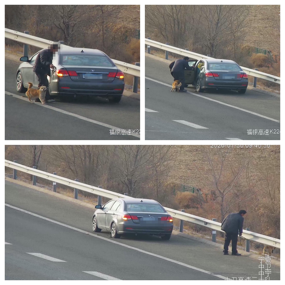 1月30日9时许,中卫市公安局交通管理局高速公路三大队民警在视频巡逻时,发现在福银高速由南向北2243公里处(长山头匝道口),有一辆轿车停在了应急车道。只见驾驶员从车内出来后,又从车内牵出两只狗,竟然在高速公路上慢悠悠地溜起了狗,存在很大安全隐患。值班员发现警情后,立即查询到驾驶员的联系方式,并要求驾驶员到大队接受处理。