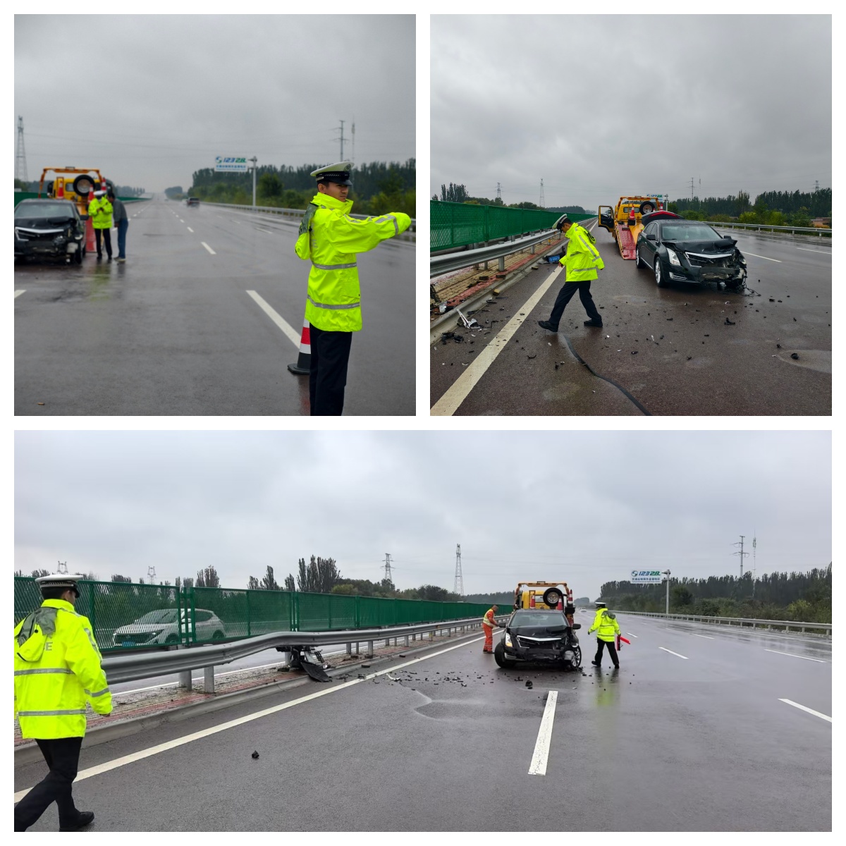民辅警闻警而动,火速赶赴事故现场,雨还在淅淅沥沥地下着。在事故现场,民警看到一辆轿车横在第一车道,现场一片狼藉,四处散落的车辆碰撞形成的碎片。民辅警做好现场安全防护工作,摆放警示装备,提醒后方来车减速慢行,避免二次事故。