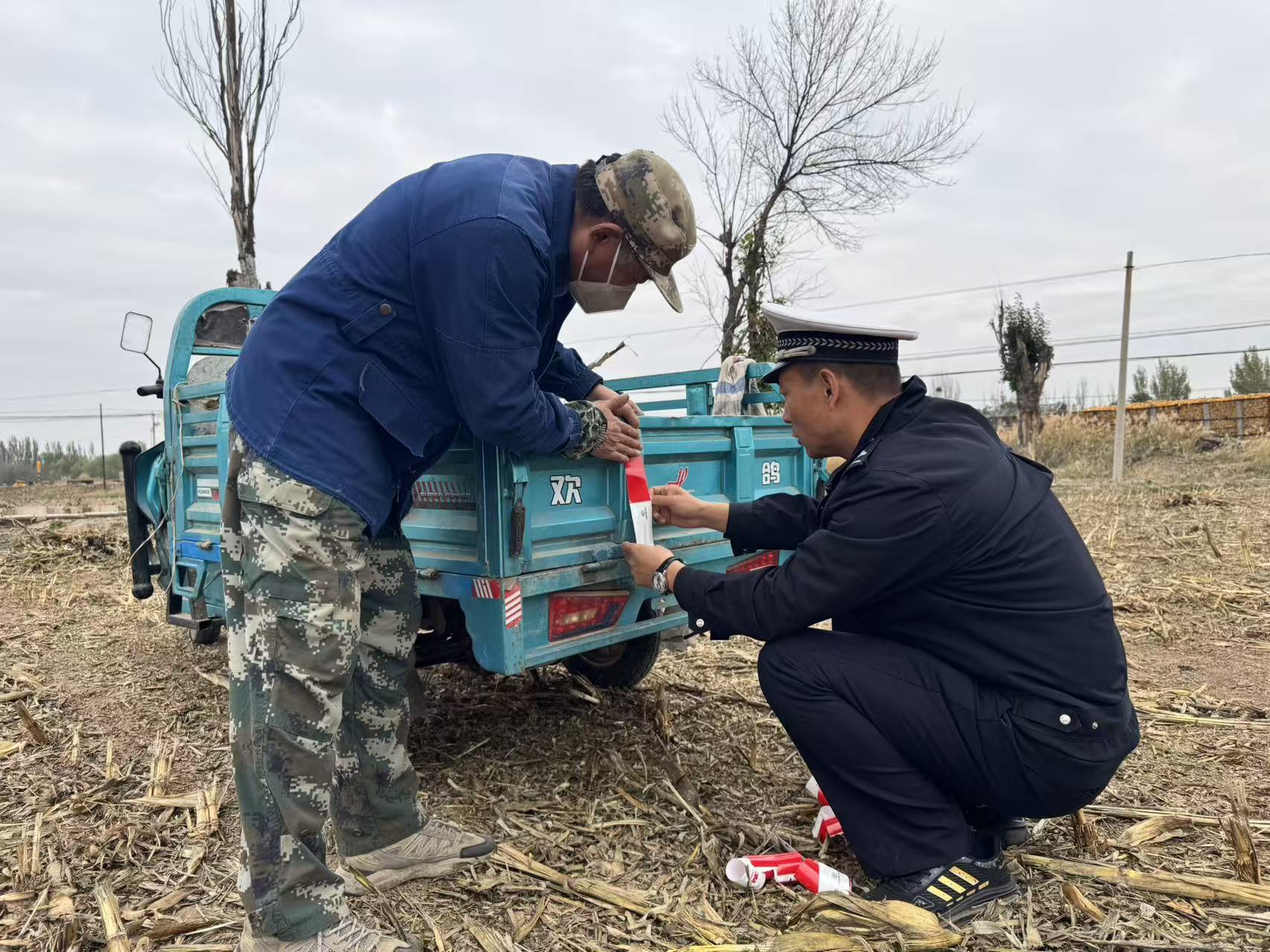 活动现场,宣传民警逐一为停靠在田埂边农田里的农用三轮车、电动代步车“装扮”反光标识。并在车头、车身侧面和货厢尾部贴出“反光条”,确保车辆在昏暗环境下明显、安全。农户们笑着说:“这一贴,晚上走夜路心里踏实多了。”
