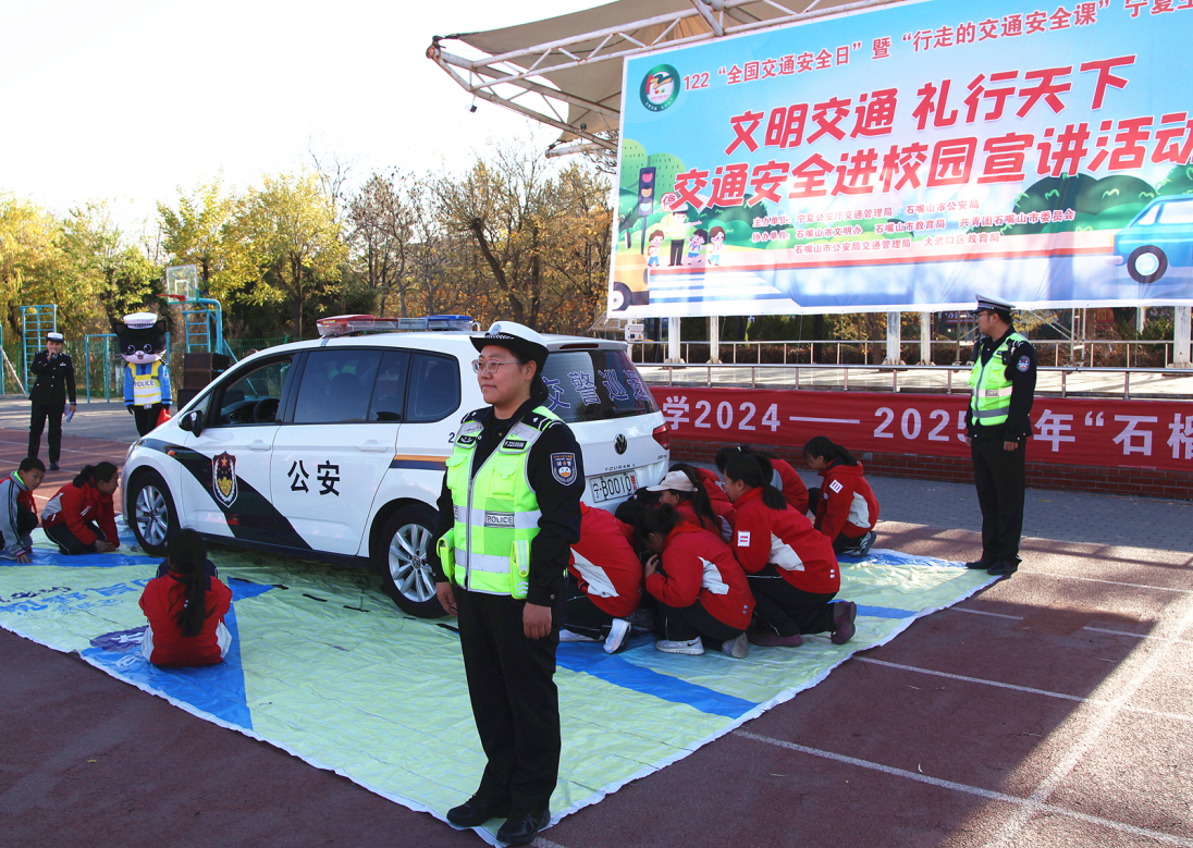 11月14日,石嘴山市公安局交通管理局民警在石嘴山市第十六小学举办122“全国交通安全日”系列活动之“行走的交通安全课”宁夏主题活动。