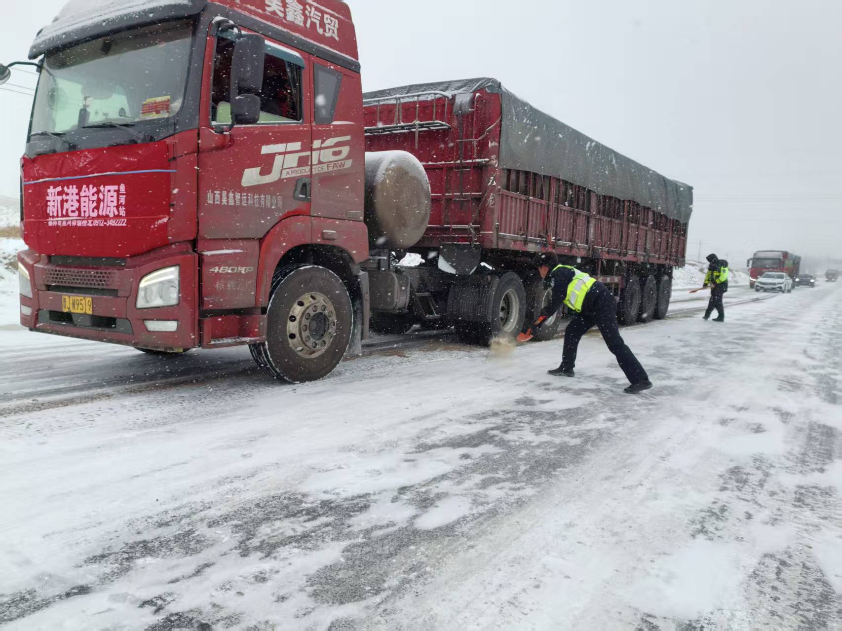 “大家再加把劲,把融雪剂撒均匀!”G344国道上,交警联合交通运输执法七大队、红寺堡公路养护站的工作人员默契配合,将一袋袋融雪剂、防滑沙均匀撒向结冰路段,巡逻警车通过喇叭循环喊话提醒“雪天路滑,请减速慢行,保持安全车距”。