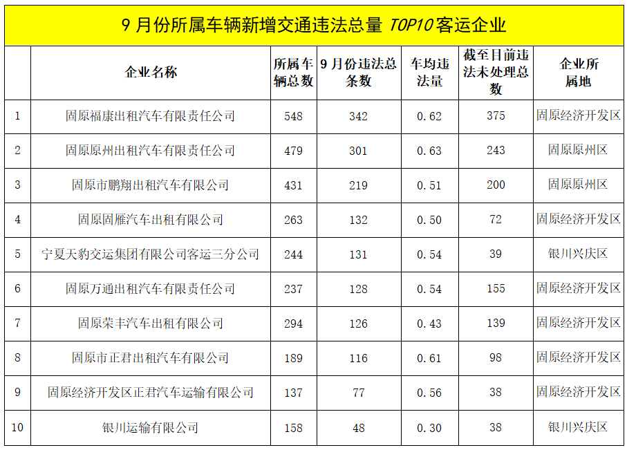 为全面加强客货运输企业和车辆的安全监管,有效预防和减少交通事故发生,进一步强化社会监督和舆论倒逼,推动客货运输企业和所属车辆驾驶员落实安全管理主体责任、及时清除安全隐患、倡导法尊守规明礼的文明交通行为,宁夏公安厅交通管理局对2025年9月份全区客运企业交通违法情况进行全面梳理,筛选出交通违法总量排名前10的客运企业进行曝光。