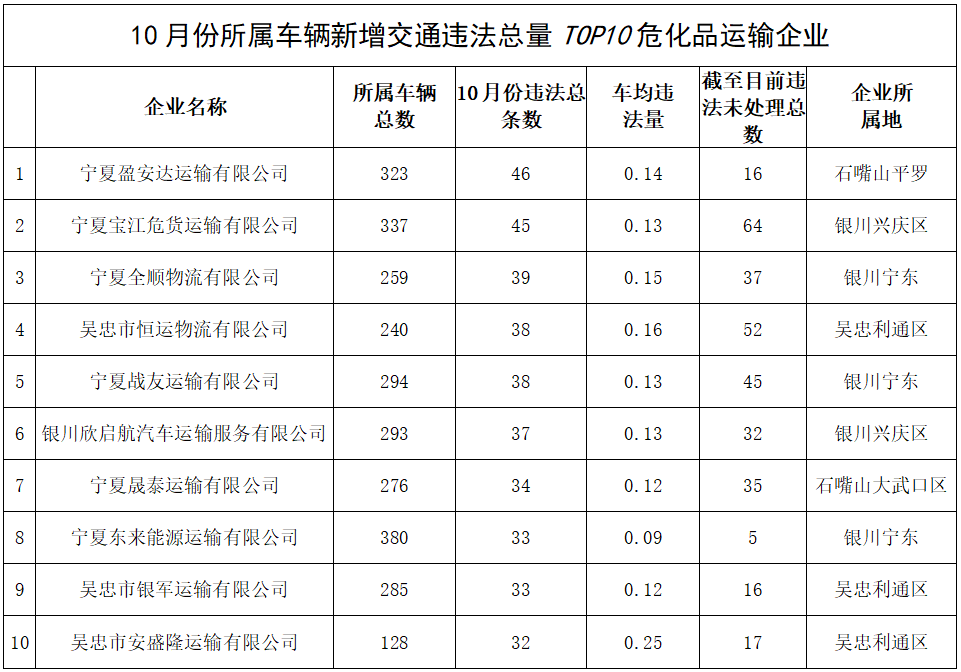 经过统计分析发现,与上月相比,10月份所属车辆新增交通违法量最多的10家危化品运输企业中,有7家企业再次“上榜”。排在“榜首”的依旧是宁夏盈安达运输有限公司(46条),车均违法量最多的企业是吴忠市安盛隆运输有限公司(0.25条),截至目前违法未处理数量最多的企业是宁夏宝江危货运输有限公司(64条)。10月份全区交通违法量最多的危化品运输车辆分别是宁夏安捷运输有限公司的宁AS0290(6条)以及宁夏嘉顺安物流有限公司的宁CE1933(5条)、宁夏晟泰运输有限公司的宁B33879(5条)。具体曝光名单如下: