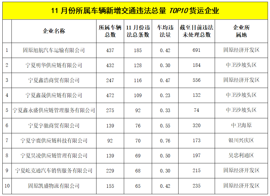 经过统计分析发现,与上月相比,11月份所属车辆新增交通违法量最多的10家货运企业中,有6家企业再次“上榜”。排在“榜首”的企业依旧是固原旭航汽车运输有限公司(185条),同时也是截至目前违法未处理数最多的企业(691条);车均违法量最多的企业是宁夏宇鹿供应链科技有限公司(0.76条)。11月份全区交通违法量最多的货运车辆分别是宁夏惠龙易通电商物流有限公司的宁AK1125(17条)、宁夏恒创快递服务有限公司的宁AB1709(17条)。具体曝光名单如下: