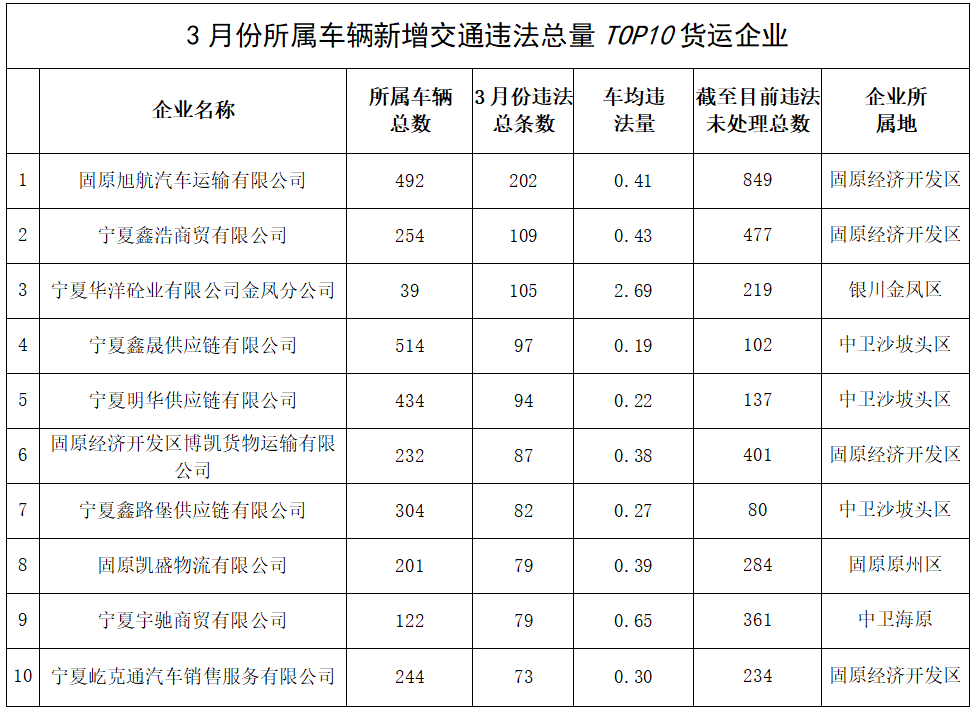 当前,宁夏交警正在开展大货车交通安全百日攻坚行动,全力服务保障春季复工复产和经济社会高质量发展,维护全区道路交通安全形势持续平稳向好。为持续加强对客货运输企业和车辆的安全监管,公安厅交通管理总队梳理了3月份全区交通违法突出的10家货运企业进行曝光,督促企业落实安全管理主体责任,加强驾驶人交通安全教育管理,防范涉及货运车辆的交通事故。