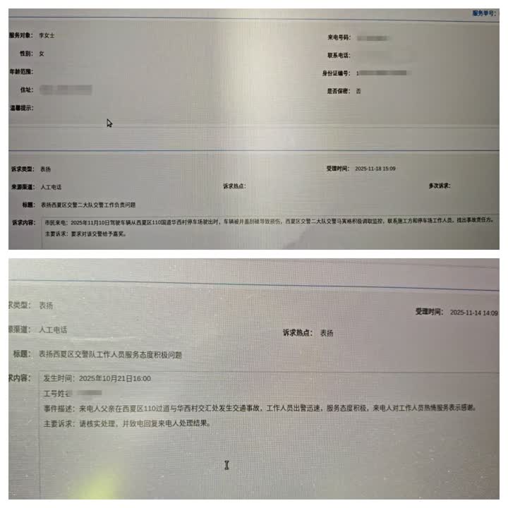 近日,银川市公安局交通管理局西夏区二大队接到两起“12345”市民服务热线转来的表扬大队出警民警马寅格的工单,对事故民警快速高效、公平公正处理交通事故表示感谢。