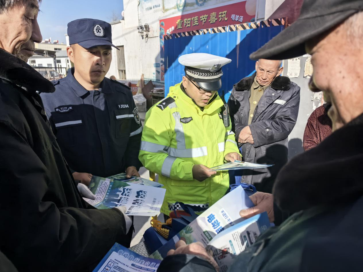 活动现场,身穿交警玩偶服的宣传人员手持大喇叭,循环播放“骑车戴头盔,安全常相伴”等通俗易懂的宣传语,穿梭在集市人流中,憨态可掬的形象吸引了不少村民驻足关注。义警队伍与民辅警分工协作,向过往村民、商户有序发放宣传彩页,用方言细致讲解电动车安全骑行规范及交通规则的核心要点,将法规条文转化为家常话,切实拉近与群众的距离,营造出浓厚的宣传氛围。