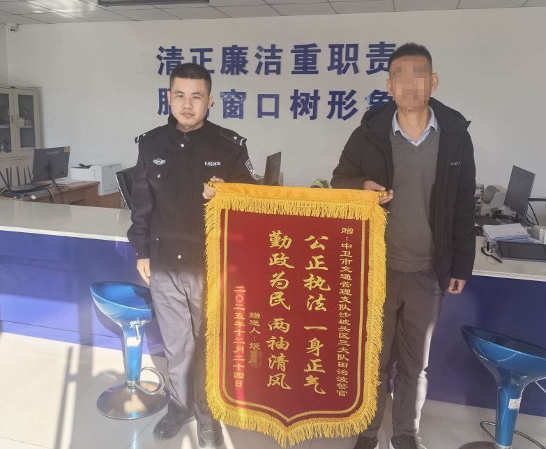 12月25日,中卫市公安局交通管理支队沙坡头区三大队车管分所收到姬先生送来一面印有“公正执法 一身正气 勤政为民 两袖清风”的锦旗。