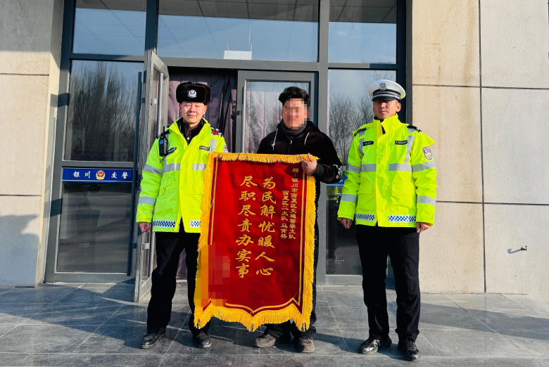 1月21日上午,乔某某将一面绣有“为民解忧暖人心 尽职尽责办实事”的锦旗送到银川市交通管理支队西夏区二大队事故民警马寅格手中,对办案民警履职尽责,公平公正处理交通事故表示衷心感谢。