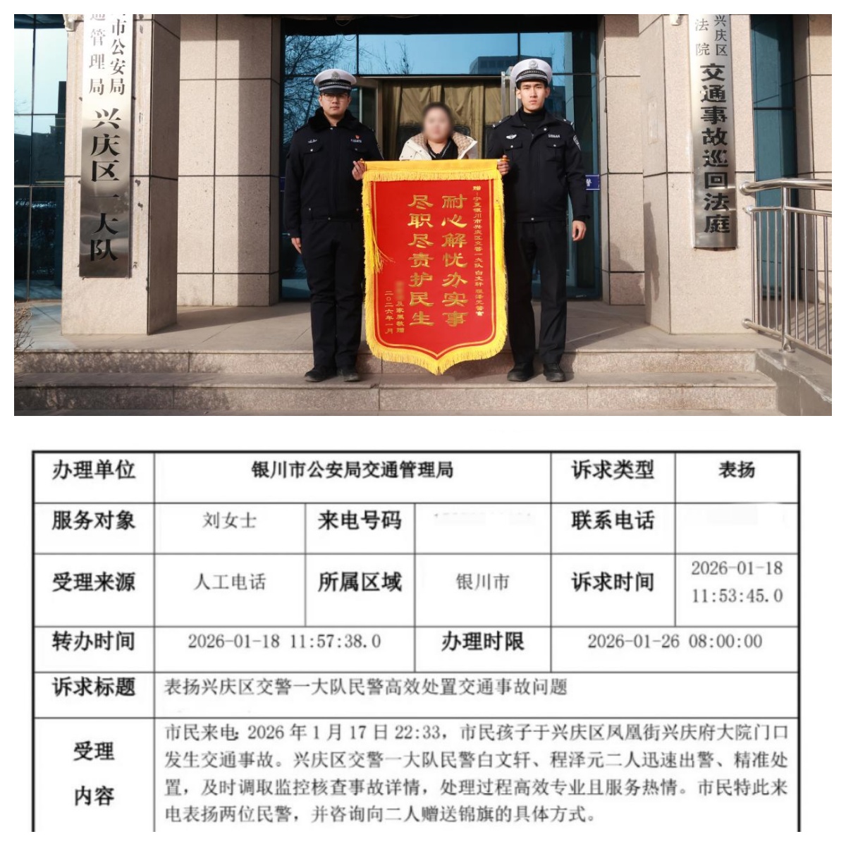 两位警官非常负责当天晚上为了处理事故熬到凌晨四点钟左右。我要给他们买夜宵也不让,太感谢了……126日下午,市民刘女士专程来到银川市公安局交通管理局兴庆区一大队,将写着“耐心解忧办实事 尽职尽责护民生”的锦旗送到大队警员白文轩、程泽元的手中。