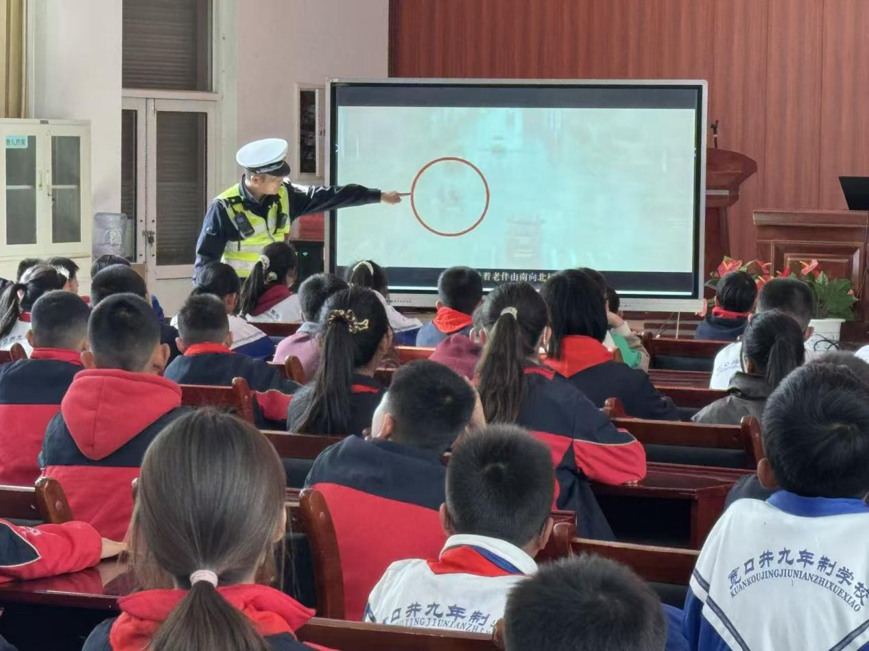当日下午,大队组织民辅警深入辖区宽口井九年制学校,开展以“法治护航开学季 安全守护伴成长”为主题的交通安全宣传教育活动。活动现场,民辅警结合精心制作的PPT课件,以学生日常步行安全为切入点,用通俗易懂的语言,向同学们讲解了上下学途中步行、骑行、乘车等各类场景的交通安全知识。