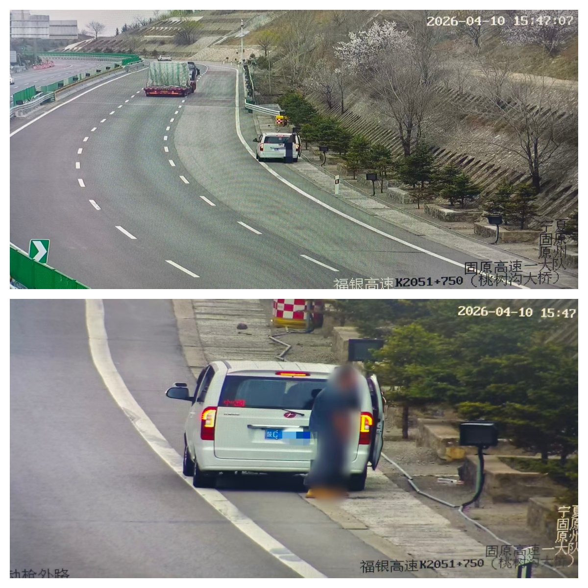 4月10日下午,固原市公安局交通管理局高速交警一大队民警通过视频监控系统对福银高速开城梁路段开展常态化巡查时,发现一辆悬挂陕C牌照的白色面包车违规停放在该路段路侧,车辆虽开启了危险报警闪光灯,但后方未按规定摆放三角警示标志。经查,该车驾驶员因临时如厕,将车辆停于路侧,未履行安全防护义务。该行为违反了《中华人民共和国道路交通安全法》相关规定,更在高速公路行车道旁形成潜在安全隐患,极易引发追尾、剐蹭等交通事故,对过往车辆及驾乘人员生命财产安全构成严重威胁。