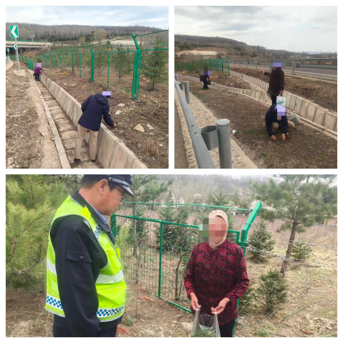 经现场了解,采摘人员均为沿线周边村民。当下正值春季,气温回暖,高速公路边坡、绿化带内野菜长势较好。部分村民贪图“新鲜野味”,心存侥幸、忽视安全,结伴翻越、钻进高速公路防护隔离网,顺着道路排水渠缝隙闯入高速路安全防护区域范围,蹲在路基旁、护栏边采摘野菜。此类行为不仅严重扰乱高速公路正常通行秩序,更将自身生命安全置于极度危险之中。
