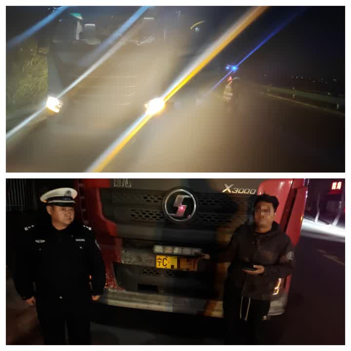 近日,吴忠交警交管二大队开展夜间巡逻时,突然看到一道刺眼的亮光袭来,晃得人睁不开眼。定睛一看,对面驶来了一辆大货车。在强光照射下,肉眼无法看清该车号牌,引起了民辅警的注意,立即示意驾驶员靠边停车接受检查。
