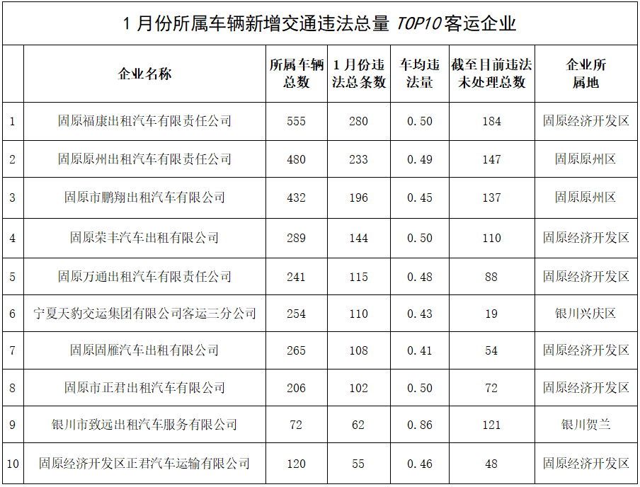 经过统计分析发现:1月份所属车辆新增交通违法量最多的10家客运企业中,有9家为固原地区客运企业。排在“榜首”的企业依旧是固原福康出租汽车有限责任公司(280条),也是截至目前违法未处理数量最多的企业(184条);其次是固原原州出租汽车有限责任公司(233条);车均违法量最多的企业是银川市致远出租汽车服务有限公司(0.86条/车)。1月份全区交通违法量最多的客运车辆分别是王磊名下的宁B86616、王小岗名下的宁AT2522以及固原荣丰汽车出租有限公司的宁DD01190,违法量均为11条。具体曝光名单如下: