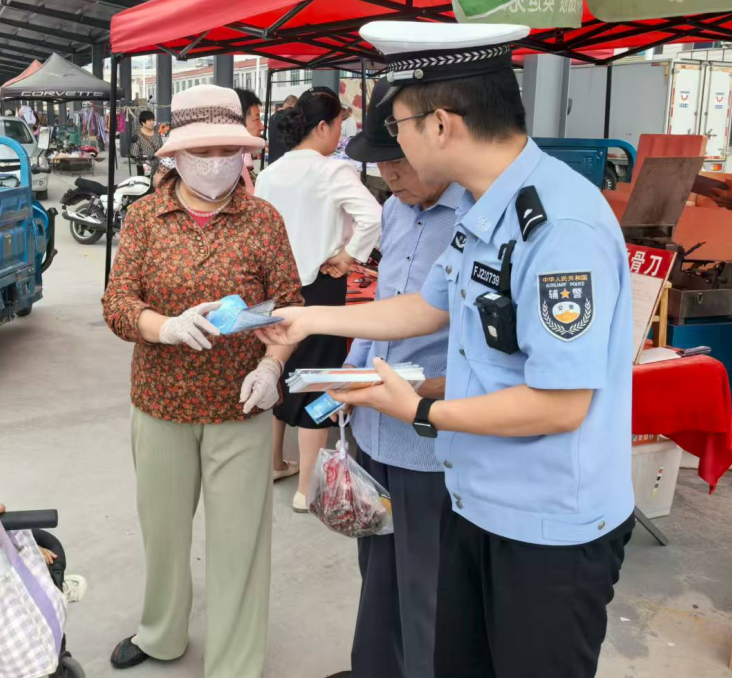 民警穿梭在集市人群中,向过往行人、摊主发放精心制作的交通安全宣传资料。资料内容涵盖步行、骑车、乘车等各类出行场景的安全注意事项。针对老年人和儿童,民警耐心叮嘱老人过马路要走人行横道、注意观察交通信号灯,不随意横穿马路;提醒家长要看护好儿童,教育孩子不在马路上玩耍。