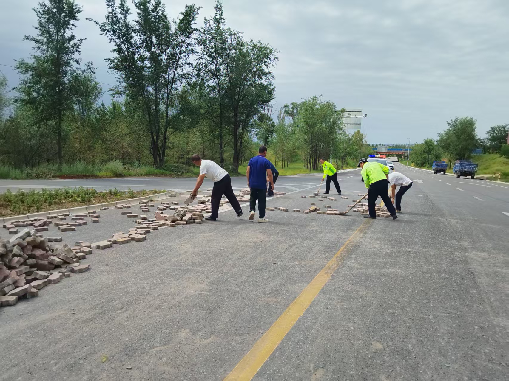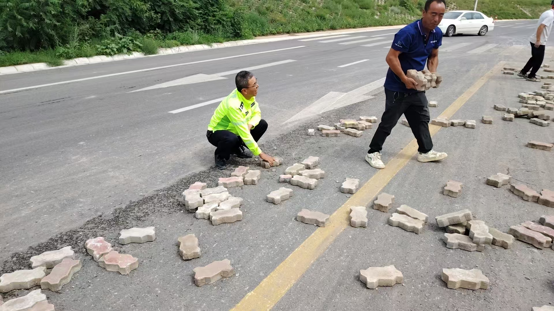 8月12日,在S201青山高速路口出现暖心一幕,盐池交管大队执勤交警帮助一辆拉砖车辆捡起掉落的砖块,及时消除了交通安全隐患,保障了道路的顺畅通行。