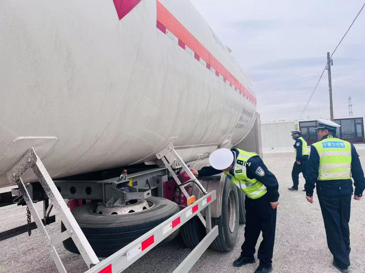在宁夏安捷泰物流有限公司,民警深入企业车辆停放区与调度室,重点核查货运车辆年检标识有效性、轮胎磨损程度以及反光条、应急三角牌等安全防护装置配备情况。