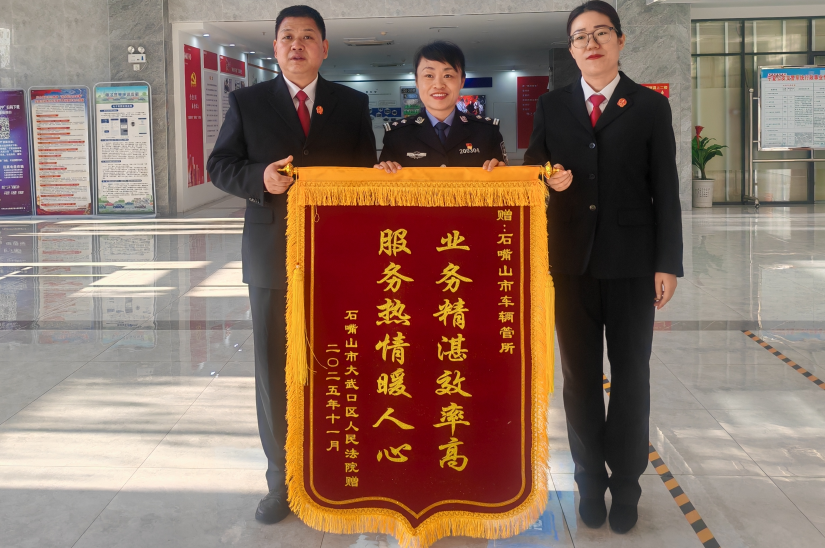 11月13日下午,石嘴山市大武口区人民法院相关负责人专程前往石嘴山市车辆管理所,将一面印有“业务精湛效率高 服务热情暖人心”的锦旗送至车管所,对车管所在司法协助工作中提供的大力支持与高效服务表达诚挚谢意。