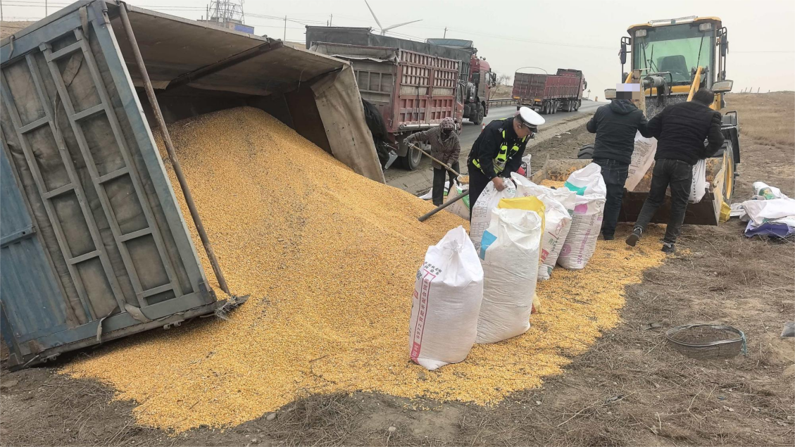 交警身先士卒,他们有人拿起铁锹,一锹一锹地将玉米铲在一起;有人顾不上玉米粒钻进鞋里、硌得脚疼,直接蹲在地上,用双手将散落的玉米快速装袋;还有人积极协调联系,很快调来了一台装载机,对大面积堆积的玉米进行高效转运。
