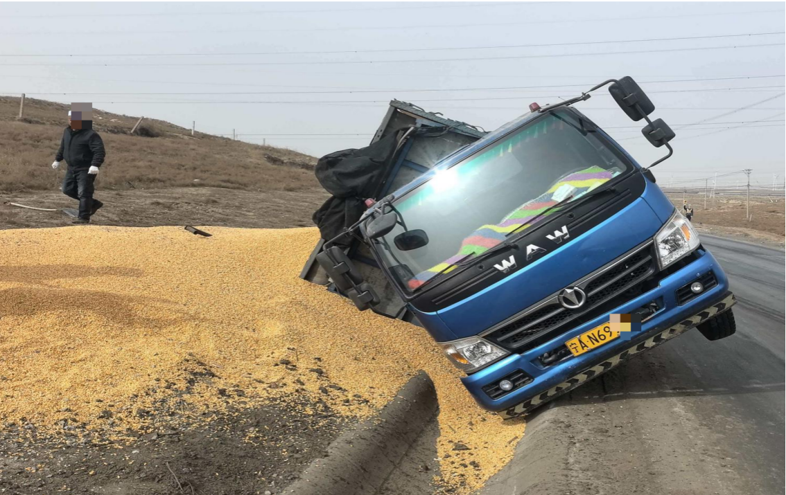 当日上午,伴随着一声巨响,一辆满载玉米的货车在行驶中不慎发生侧翻,所幸未造成人员伤亡。满车的玉米散落一地,形成了数十米长的“黄金”障碍带。308省道作为辖区交通要道,车流量较大,满地滚动的玉米粒不仅给车主带来了巨大的经济损失,更对过往车辆的行车安全构成了严重威胁,极易引发二次交通事故。
